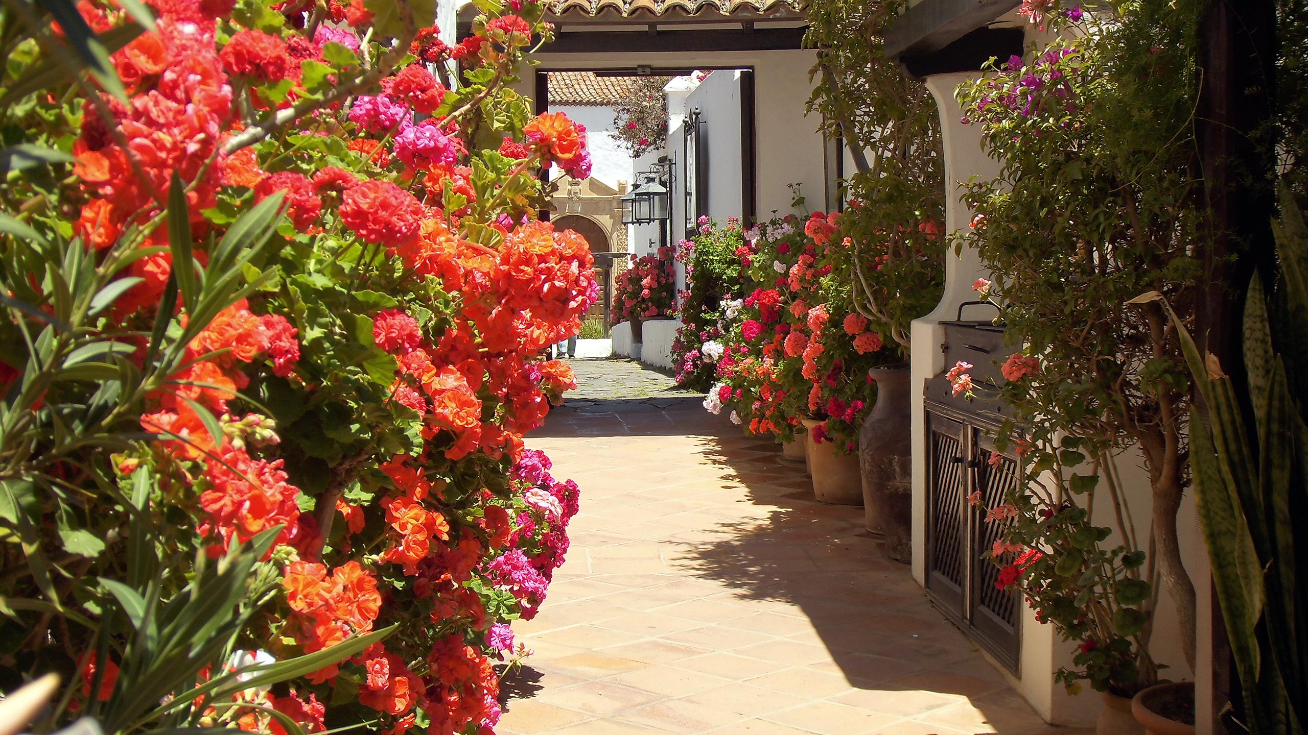 Wo Wasser ist grünt und blüht es in Hülle und Fülle.  Hier neben dem Eingang des Restaurants Casa Santa Maria in Betancuria. Dahinter befindet sich eine  gut besuchte Multivisionsshow.