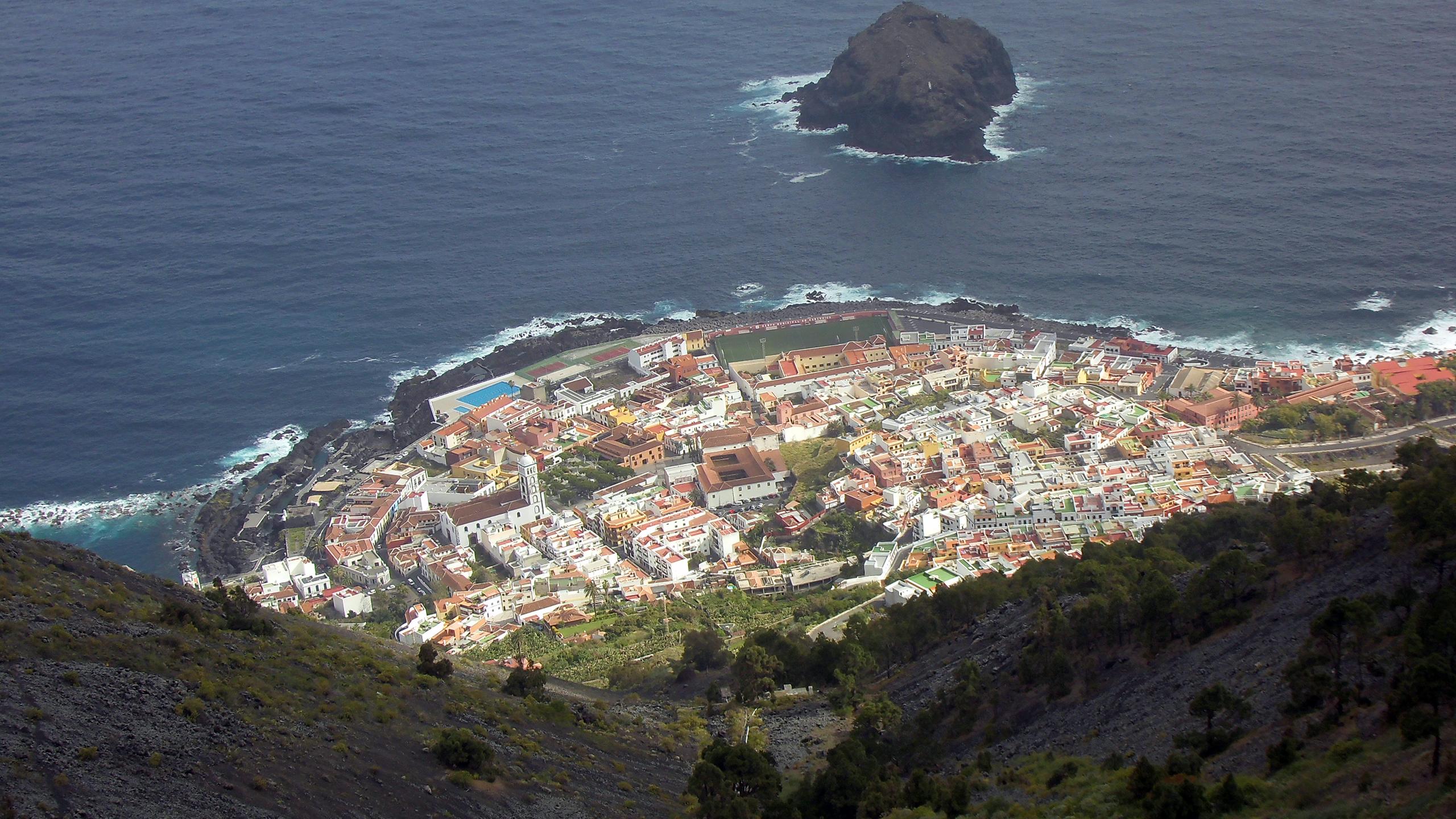Interessanter Ausblick vom Parkplatz einer Raststätte auf den Ort Garachico und den dazugehörigen Felsen “Roque de Garachico“.
