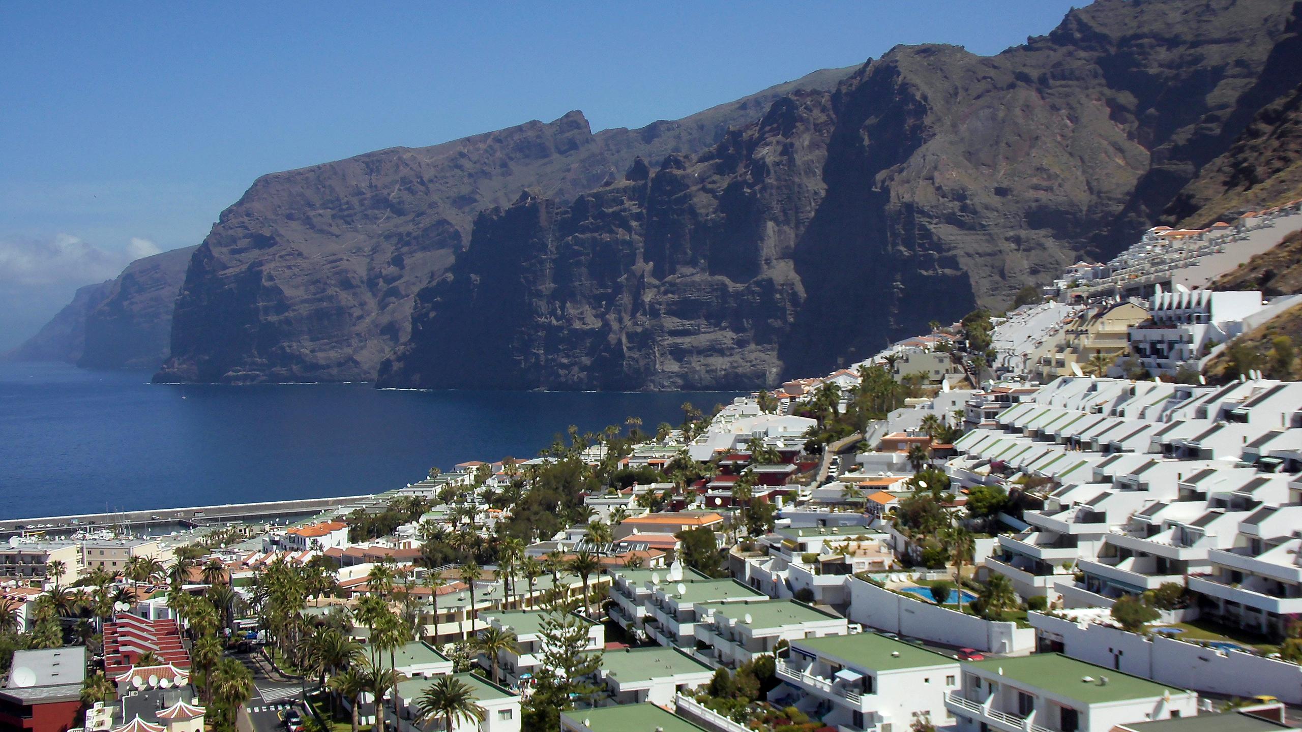 Die imposanten  ca. 7 km langen Felsformationen  von Los Gigantes  mit der Stadt Puerto de Santiago im Vordergrund.